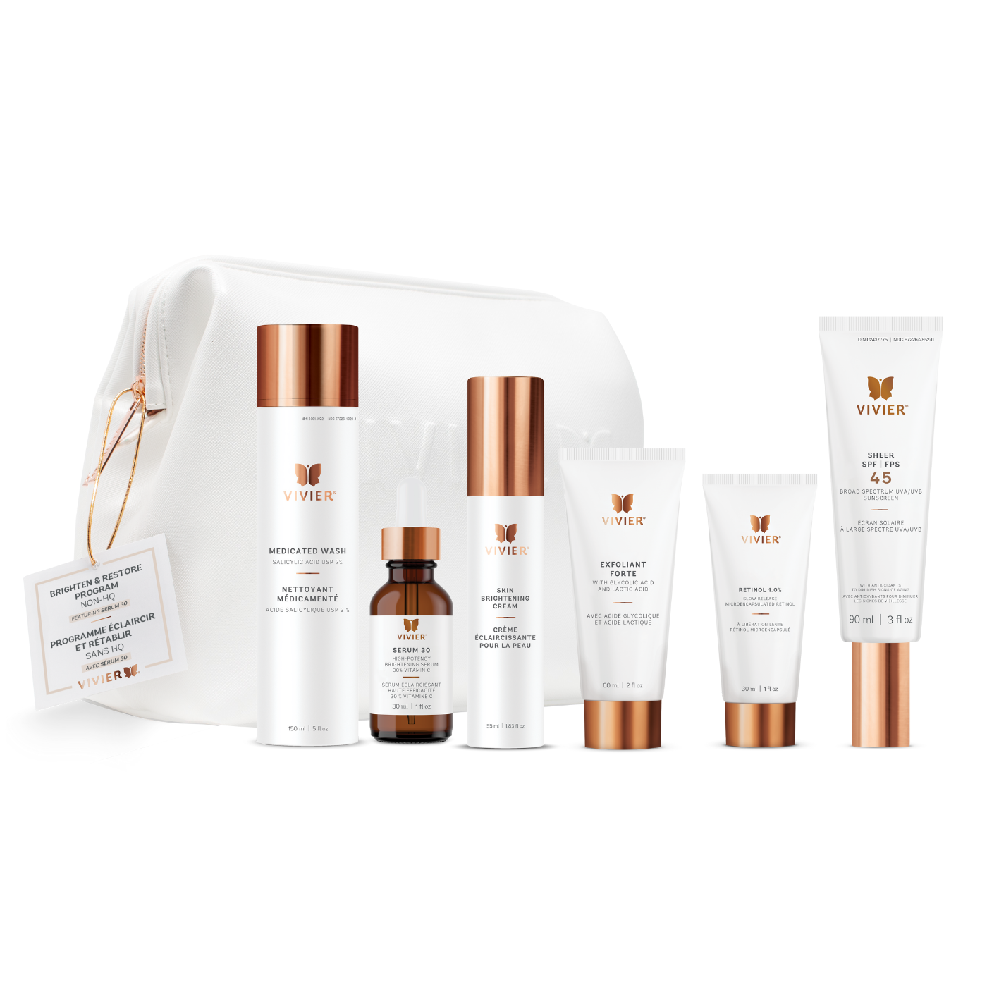 Le programme Éclaircir et rétablir propose une gamme complète de soins conçus pour réduire l’apparence des taches pigmentaires et des ridules, tout en améliorant l’uniformité du teint et la texture de la peau. Il contribue également à protéger la peau contre les agressions futures et à raviver son éclat naturel — le tout sans hydroquinone.